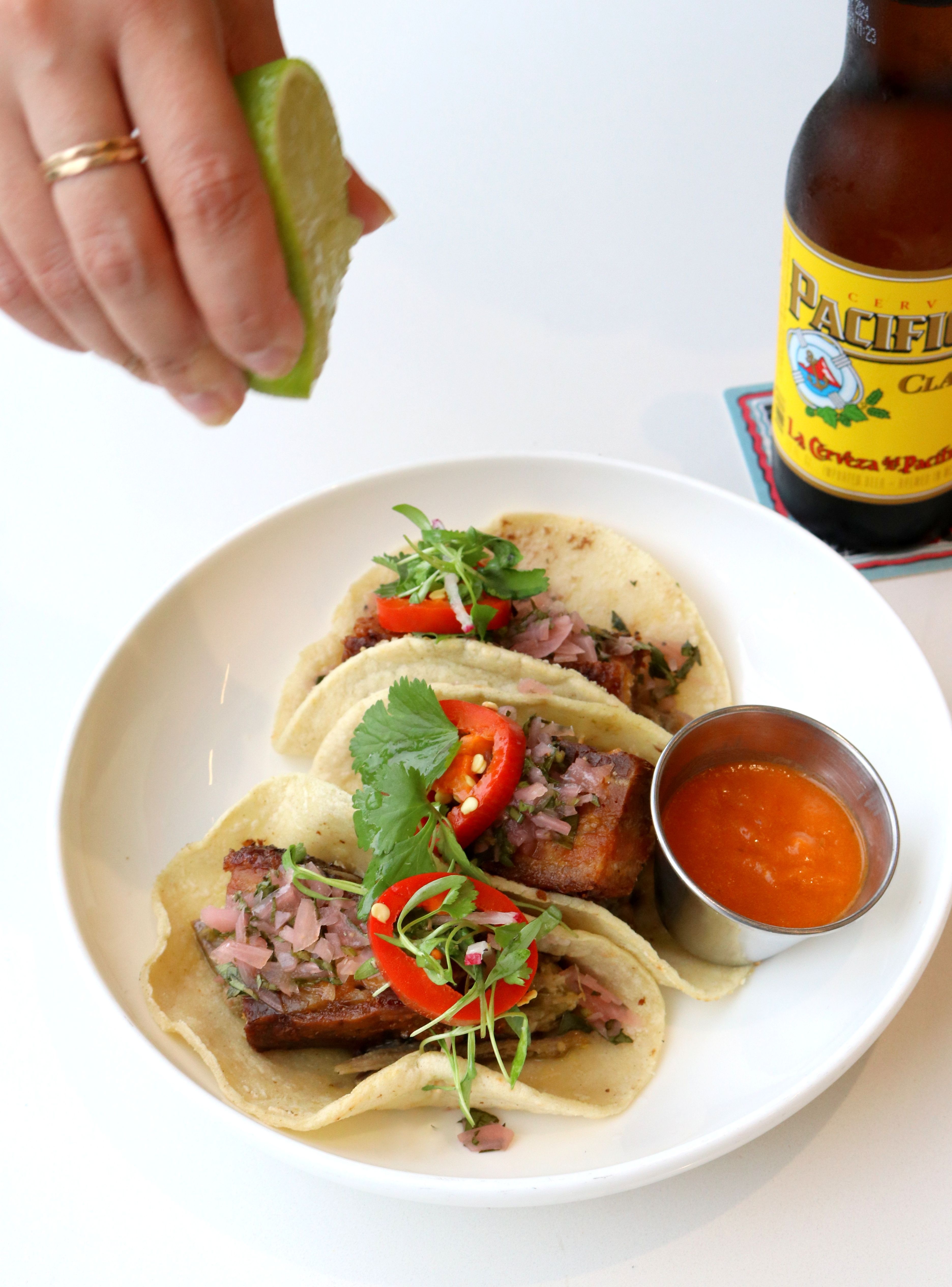 Crispy pork belly tacos, refritos, pickled red onion relish, salsa verde, habanero, corn tortillas 17