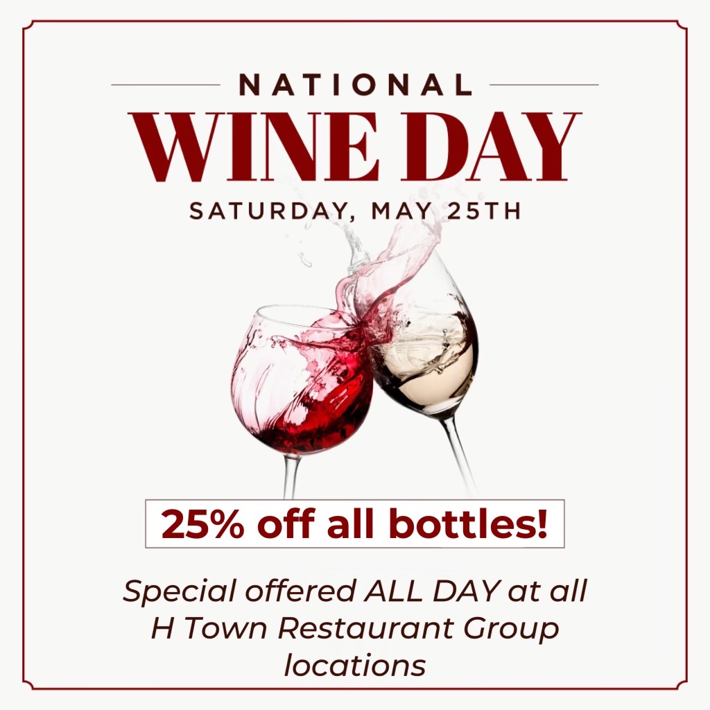 We are offering 25% off ALL bottles of wine at all H Town Restaurant Group locations, Backstreet Cafe, Hugo's, Caracol, Xochi & URBE. This special is available all day long! Cheers!